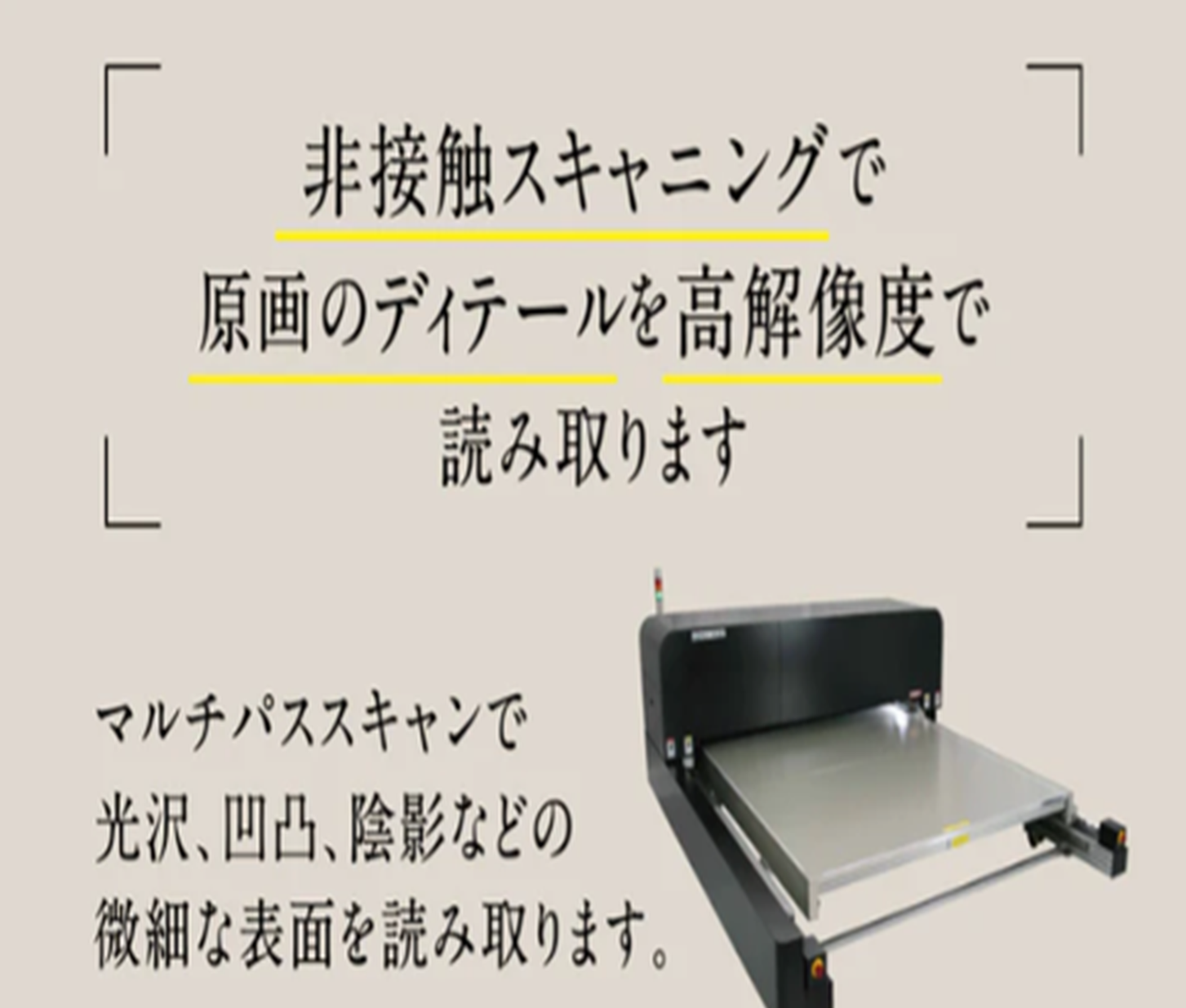 非接触スキャニングで原画のディテールを高解像度でデータ化可能です。 マルチパススキャンで光沢、凹凸、 陰彩などの微細な表面を読み取ります。