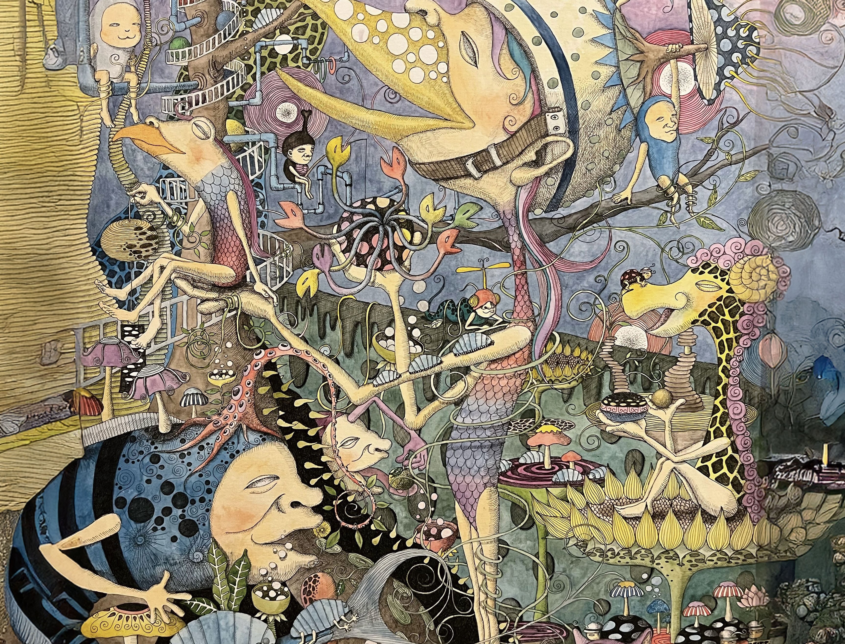 コロナ禍に描いた作品で、中央にいるアマビが手のひらに小さなアマビエを乗せて、1日も早くこの状況が収まりますようにという願いを込めています。誰もが早くおさまって普通の生活がしたいと思っていたあの頃を思い出すと、今の生活が尊く思うことができるかと思います。そんな気持を忘れちゃだめだなという作者の願いを込めました。