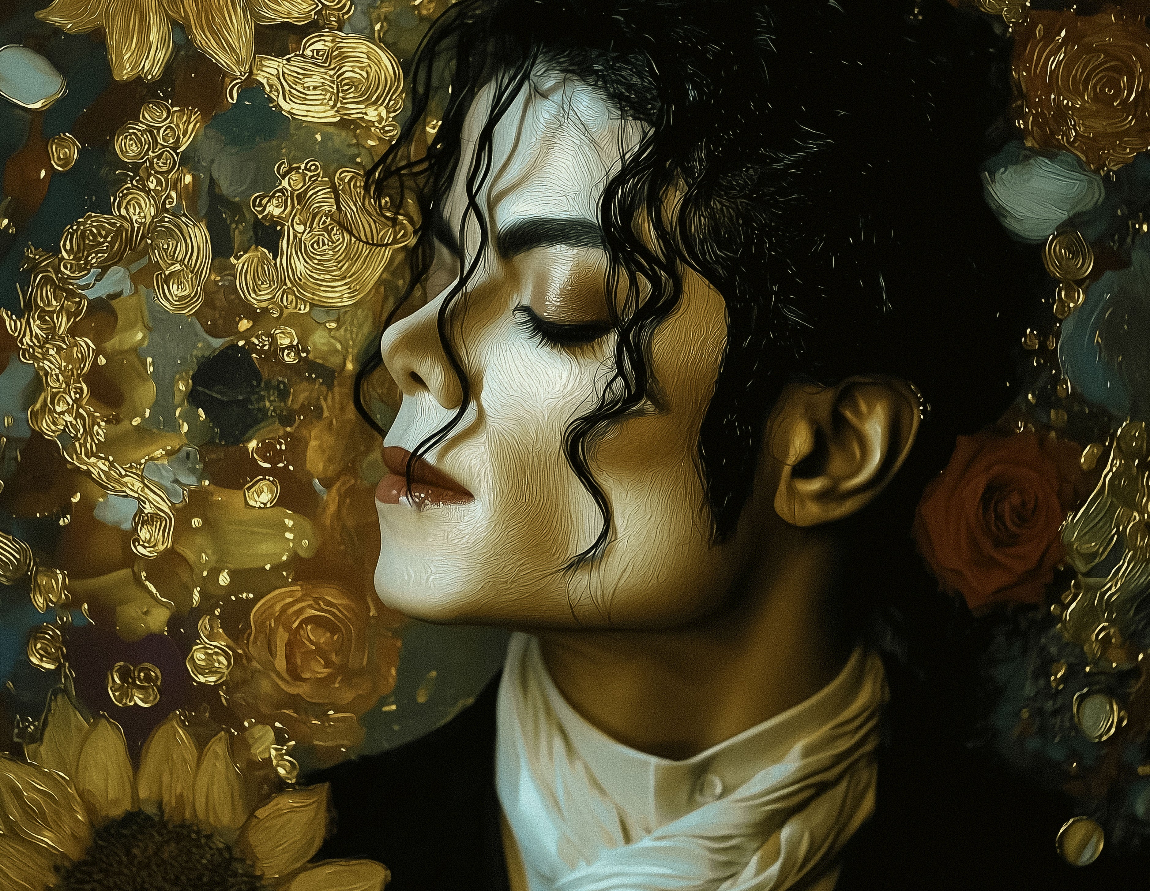 深い静寂の中で花々と光に包まれる姿は、永遠に輝く魂を象徴しています。鮮やかな向日葵と薔薇、そして黄金の煌めきが重なり合い、観る者の心に温かな希望と感動を届けます。リビングやギャラリー空間を華やかに彩り、日常に特別な輝きをもたらす一枚です。