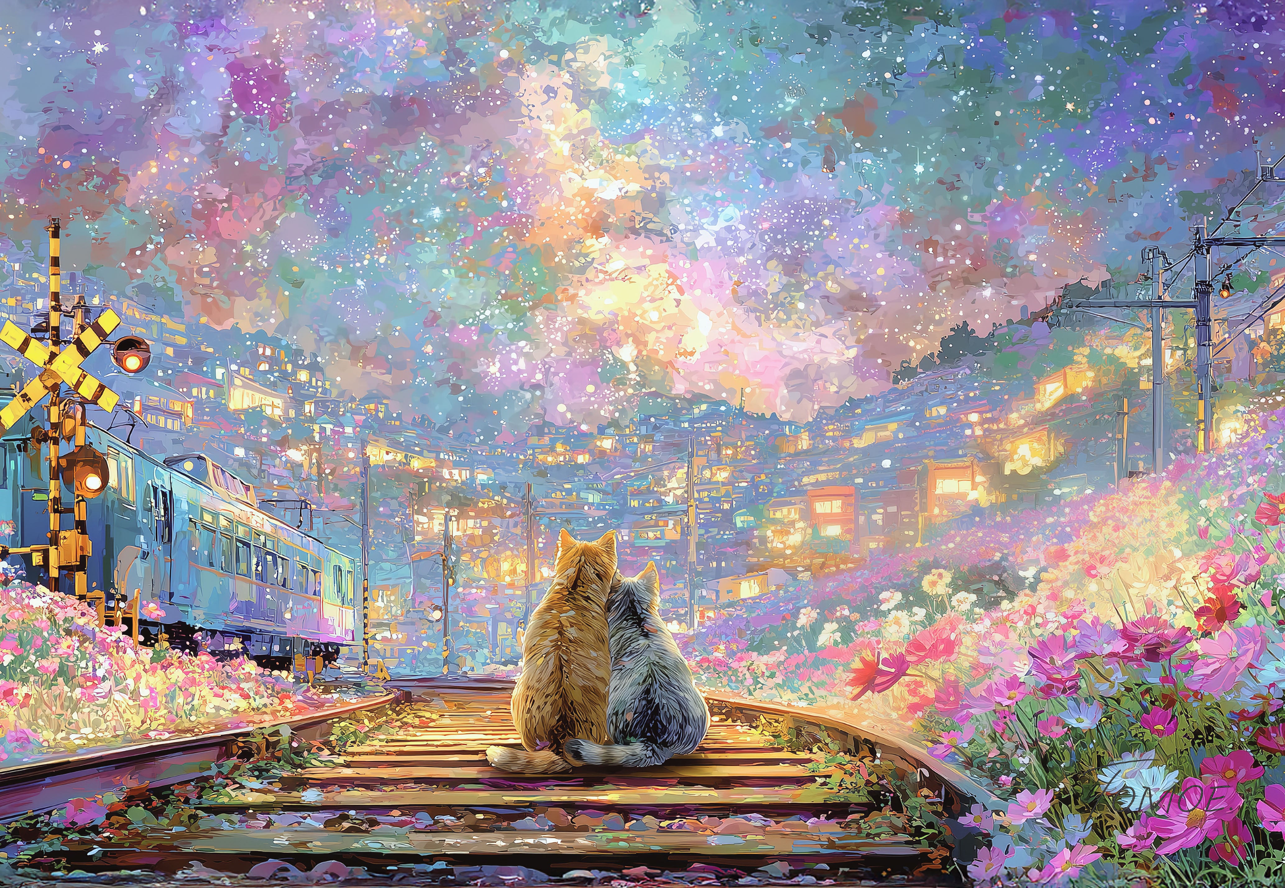 On a starlit night, two cats sit together on a hill of cosmos flowers, watching a magical train cross the sky above distant town lights.