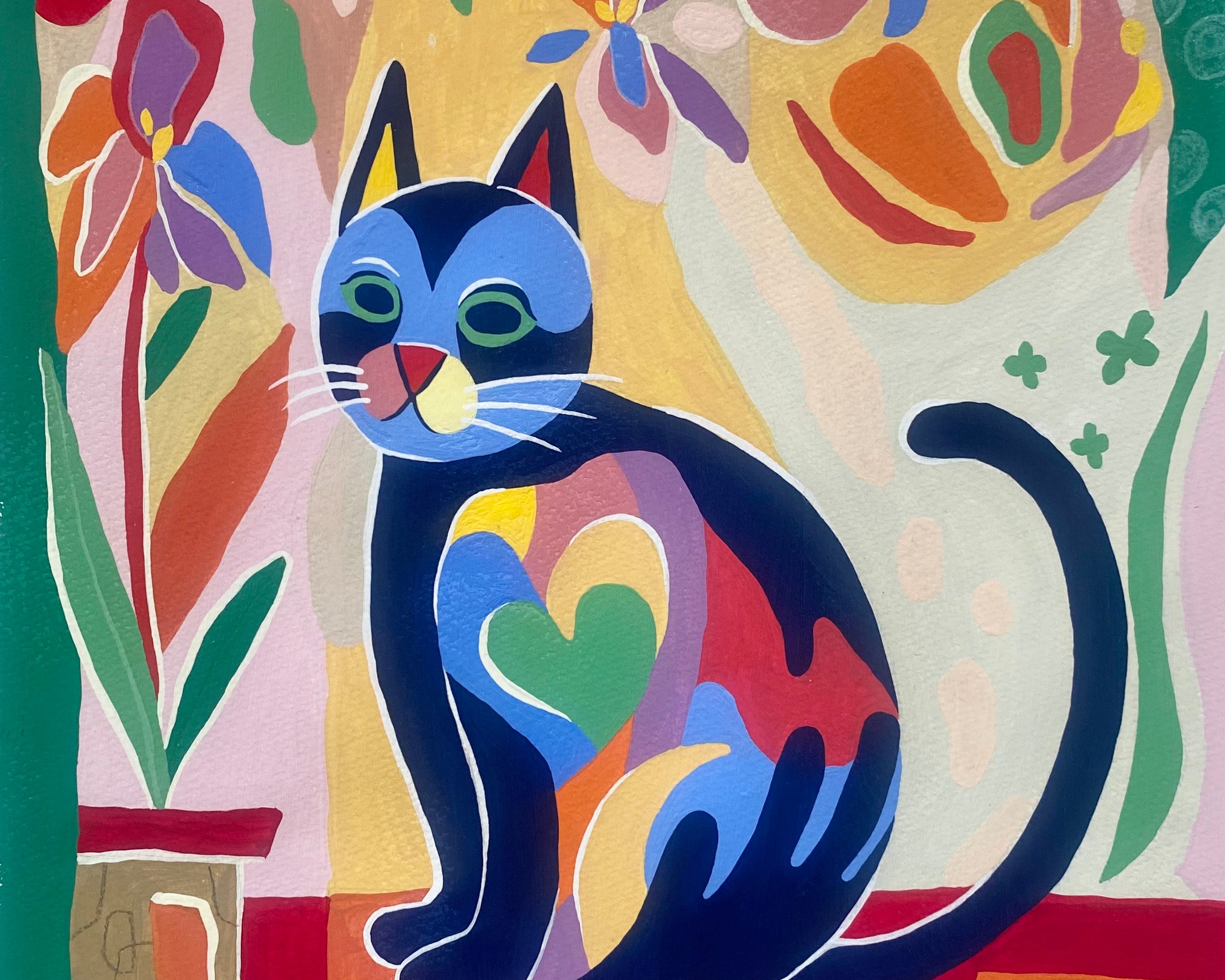 背景の抽象的な花模様は、猫の内なる感情の豊かさを映し出しているかのよう。